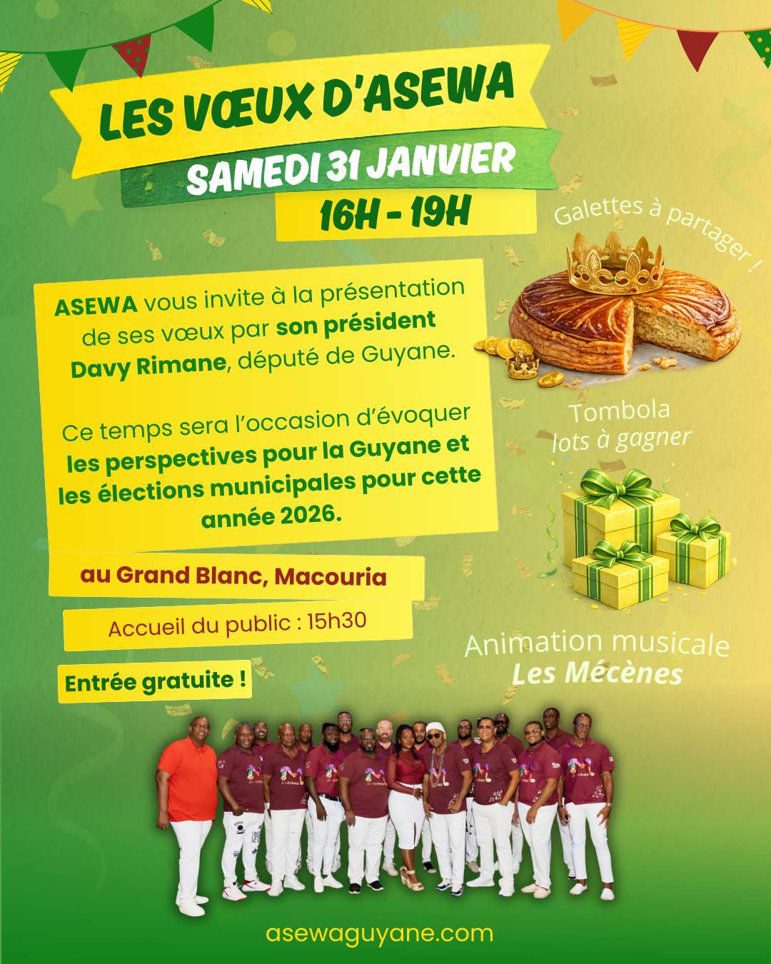 Les vœux d’ASEWA auront lieu le samedi 31 janvier 2026 à partir de 16h au Grand Blanc à Macouria. L'entrée est gratuite pour tous. Nous vous attendons nombreux pour cet évènement !